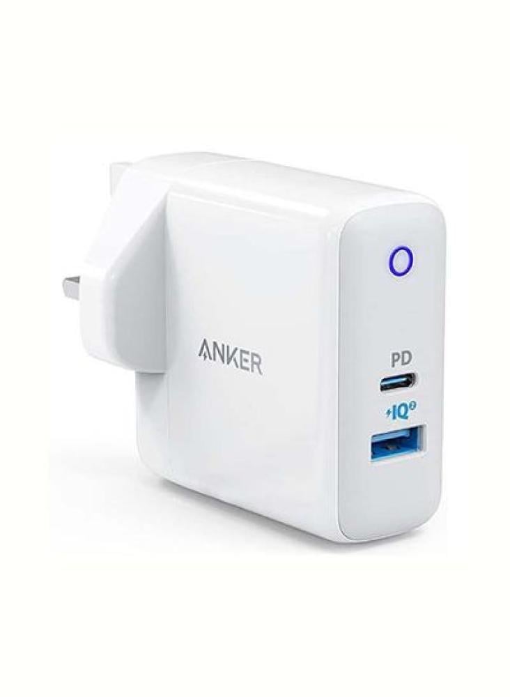 شاحن جداري انكر باور بورت اتوم 3 منفذين بقدرة 45 واطشاحن باور بورت اتوم 3 بمنفذي بي اي كيو 3.0 وتقنية غان 60 واط من انكر، شاحن للسفر مع منفذ يو اس بي نوع سي 45 واط لاجهزة اللابتوب وماك بوك وايباد برو وايفون وجالكسي وبكسل ذات منافذ يو اس بي نوع سي، ابيض