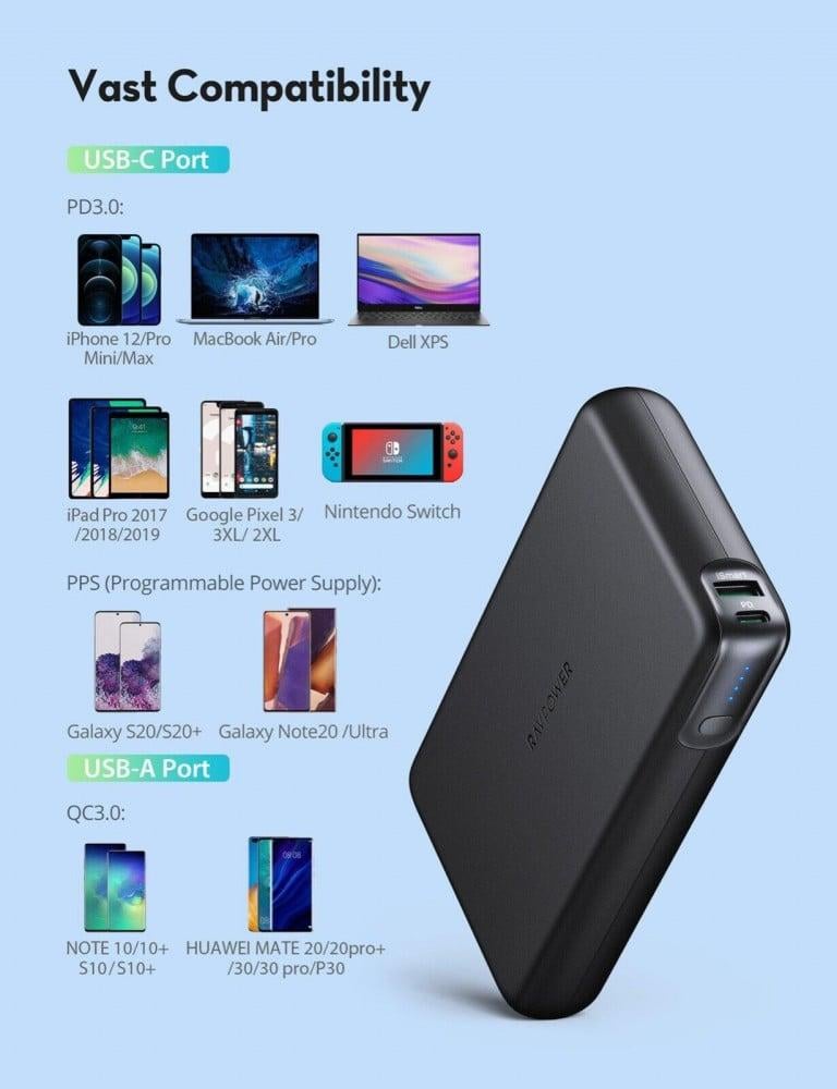تحتوي البطارية على منفذين لشحن جميع الأجهزة التي تعمل بنظام USB تقريبًا بما في ذلك أجهزة الكمبيوتر المحمولة والأجهزة اللوحية والهواتف الذكية والمزيد.