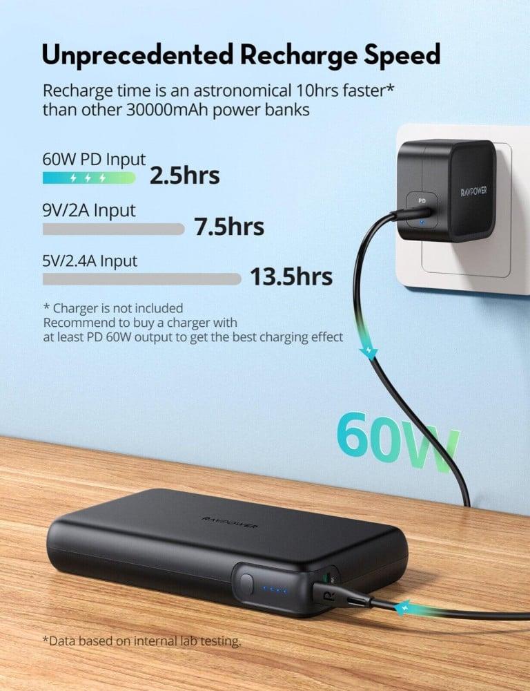 الحل المثالي لشحن أجهزتك في مختلف الأماكن، بطارية متنقلة من راف باور بتقنية الشحن السريع يصل الى 100 واط و سعة 30000 ملي امبير