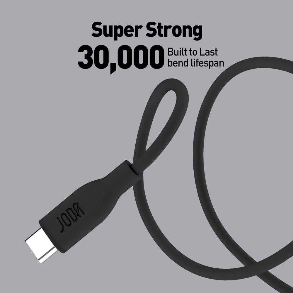 ما يميز هذا الكابل هو تصنيعه من مادة السيليكون المتينة والمرنة. هذا التصميم يمنحه مقاومة عالية للطي والانثناء، حيث يتحمل ما يصل إلى 30,000 طية دون تلف. بالإضافة إلى ذلك، الغلاف السليكوني الناعم والأنيق باللون الاسود يعطيه مظهرًا جذابًا ومناسبًا للاستخدام اليومي.